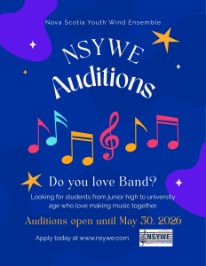 The NSYWE is Nova Scotia’s honours wind ensemble for talented young musicians from junior high to university age students.